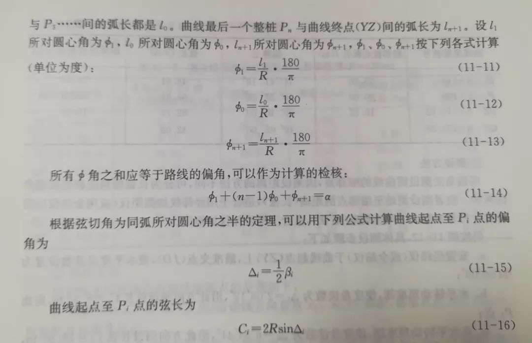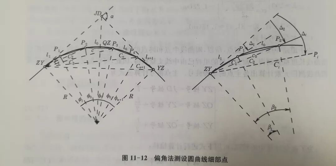 用偏角法测设圆曲线上的细部点是以曲线起点(或终点)作为测站,计算出测站至曲线上任一细部点Pi的弦线与切线的夹角—弦切角△i(称为偏角)和弦长Ci或相邻细部点的弦长c,据此确定Pi点的位置,如图11-12所示。曲线上的细部点即曲线上的里程桩,一般按曲线半径R规定弧长为lo的整桩。lo一般规定为5m、10m和20m,R越小,lo也越小。P1为曲线上的第一个整桩,它与曲线起点(ZY)间弧长为l1(l1<lo),以后P1与P2,P2