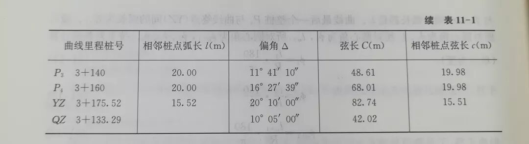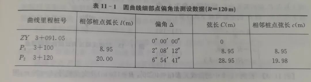 ②测设方法用偏角法测设圆曲线的细部点,因测设距离的方法不同,可分为长弦偏角法和短弦偏角法两种。前者测设测站至细部点的距离(长弦),适合于用经纬仪加测距仪(或用全站仪);后者测设相邻细部点之间的距离(短弦),适合于用经纬仪加钢尺仍按图11-12,具体测设步骤如下: a安置经纬仪(或全站仪)于曲线起点(ZY)上,瞄准交点(D),使水平度盘读数设置为00°00′00″;b水平转动照准部,使度盘读数为△1=2°08′12″,沿此方向测设弦长C1=8.95m,定出P1点;c再水平转动照准部,使度盘读数为△2=6°54′41”,沿此方向测设长弦C2=28.95m,定出P2点;或从P1点测设短弦c0=19.88m,与偏角△2的方向线相交而定出P2点,以此类推,测设P3、P4点;d测设至曲线终点(YZ)作为检核:水平转动照准部,使度盘读数为△Yz=20°10′00″,在方向上测设长弦Cyz=82.74m,或从P4测设短弦cn+1=15.51m,定出一点。此点如果与YZ不重合,其闭合差一般应按如下要求:半径方向(路线横向):不超过士0.1m;切线方向(路线纵向):不超过士L/1000(L为曲线长)。