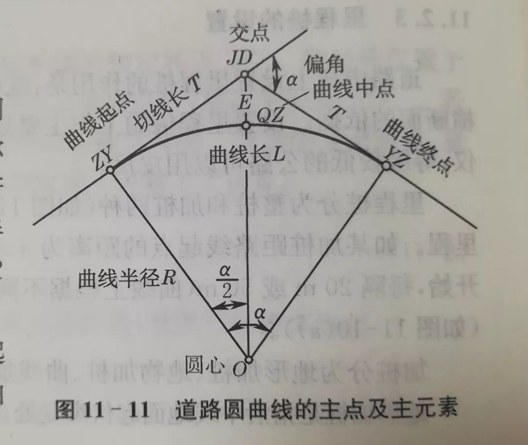 当路线由一个方向转到另一个方向时,必须用曲线来连接。曲线的形式较多,其中,圆曲线(又称单曲线)是最基本的一种平面曲线。如图11-11所示,偏角a根据所测右角(或左角)计算;圆曲线半径R根据地形条件和工程要求选定。根据a和R可以计算其他各个元素。