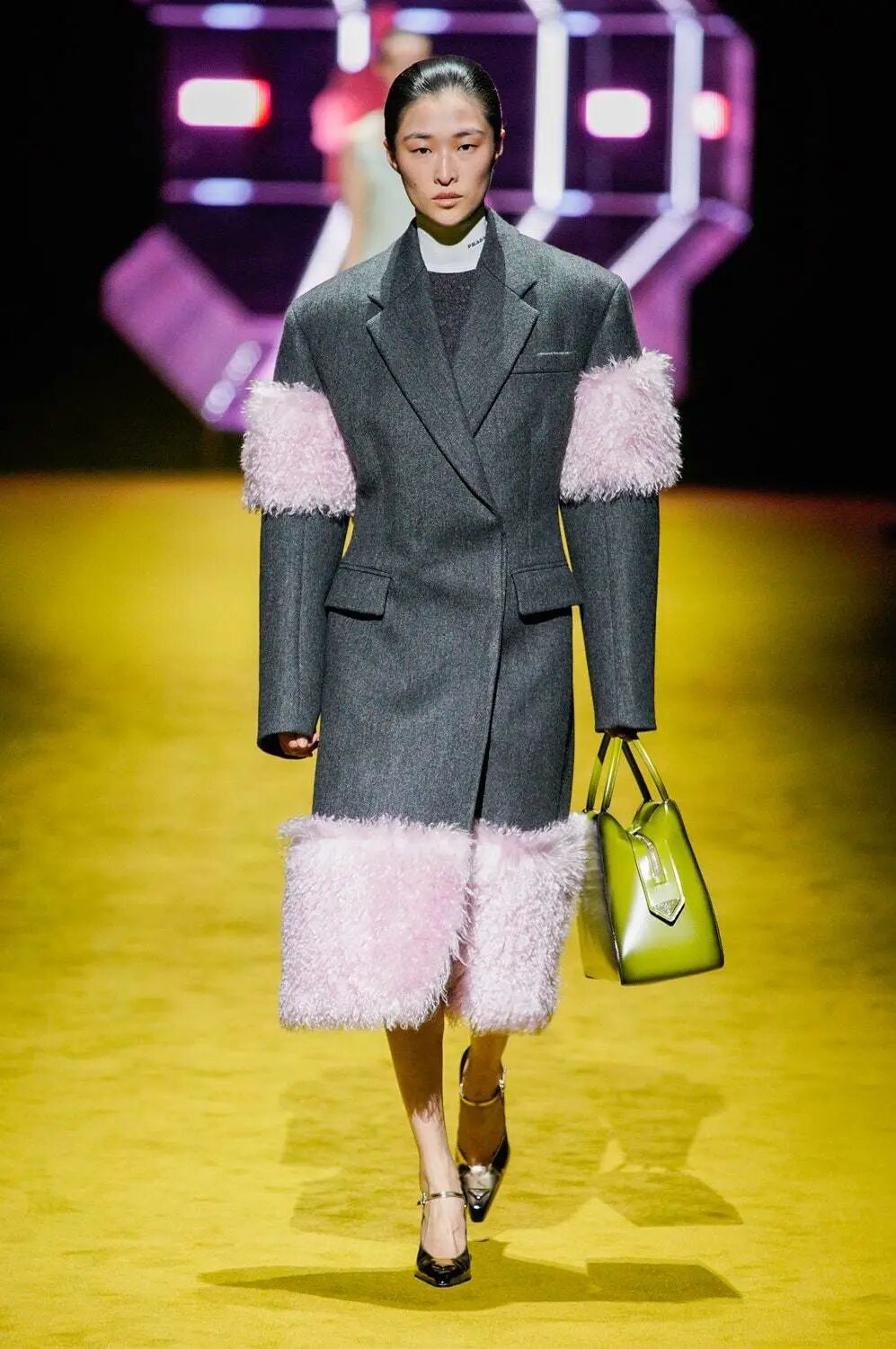 在一片至酷的中性色调中,偶尔冒出来的绚丽色彩,令简约的穿搭体现出“不简单”的风格。