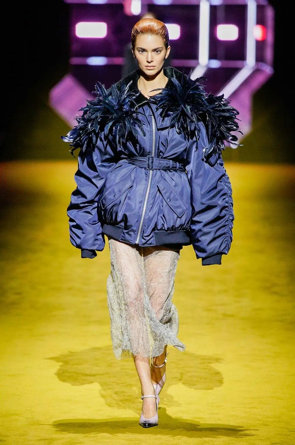 例如宽肩的廓形,皮草袖饰、飞行员夹克等。而在材质上,使用简洁的罗纹背心、透明薄纱面料和厚重的秋冬服饰形成鲜明对比。尤其是贯穿整个系列的半身裙,与毛料、缎面、皮革、薄纱等材质融合拼接,构成了一个刚柔并济的系列。