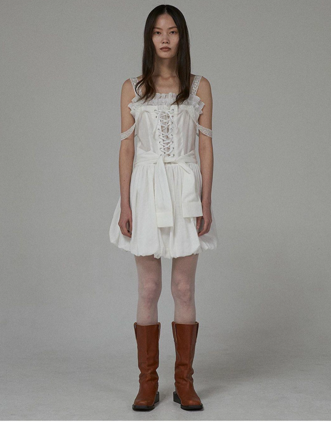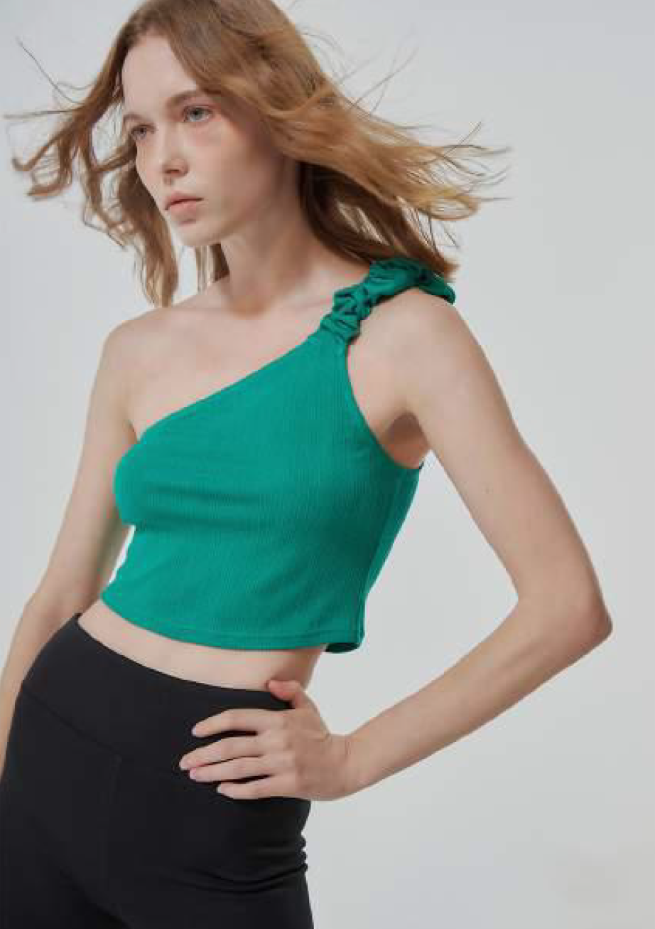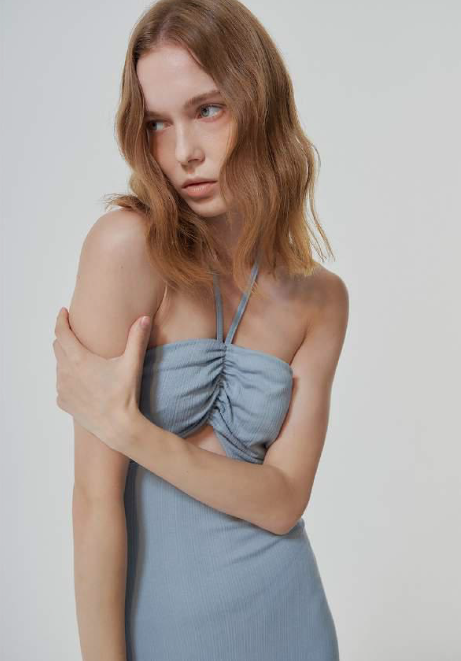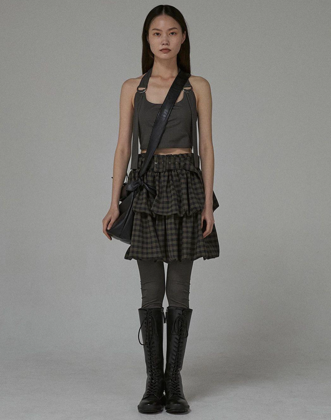 21年春夏系列, 短款背心让女性可以随意活动,方便露出美好的腰部曲线,更增添了一丝魅力。通身选择深色系,搭配高腰短裙,不规则的下摆给All black的搭配增加一份性感若隐若现的同时多了一丝不可轻犯的坚毅感。