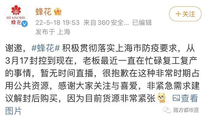 谢邀,蜂花积极贯彻落实上海市防疫要求,从3月17封控到现在,老板最近一直在忙碌复工复产的事情,暂无时间直播,很抱歉在这种非常时期占用公共资源,感谢大家关注与喜爱,非紧急需求建议解封后购买,因为目前货源非常紧张。