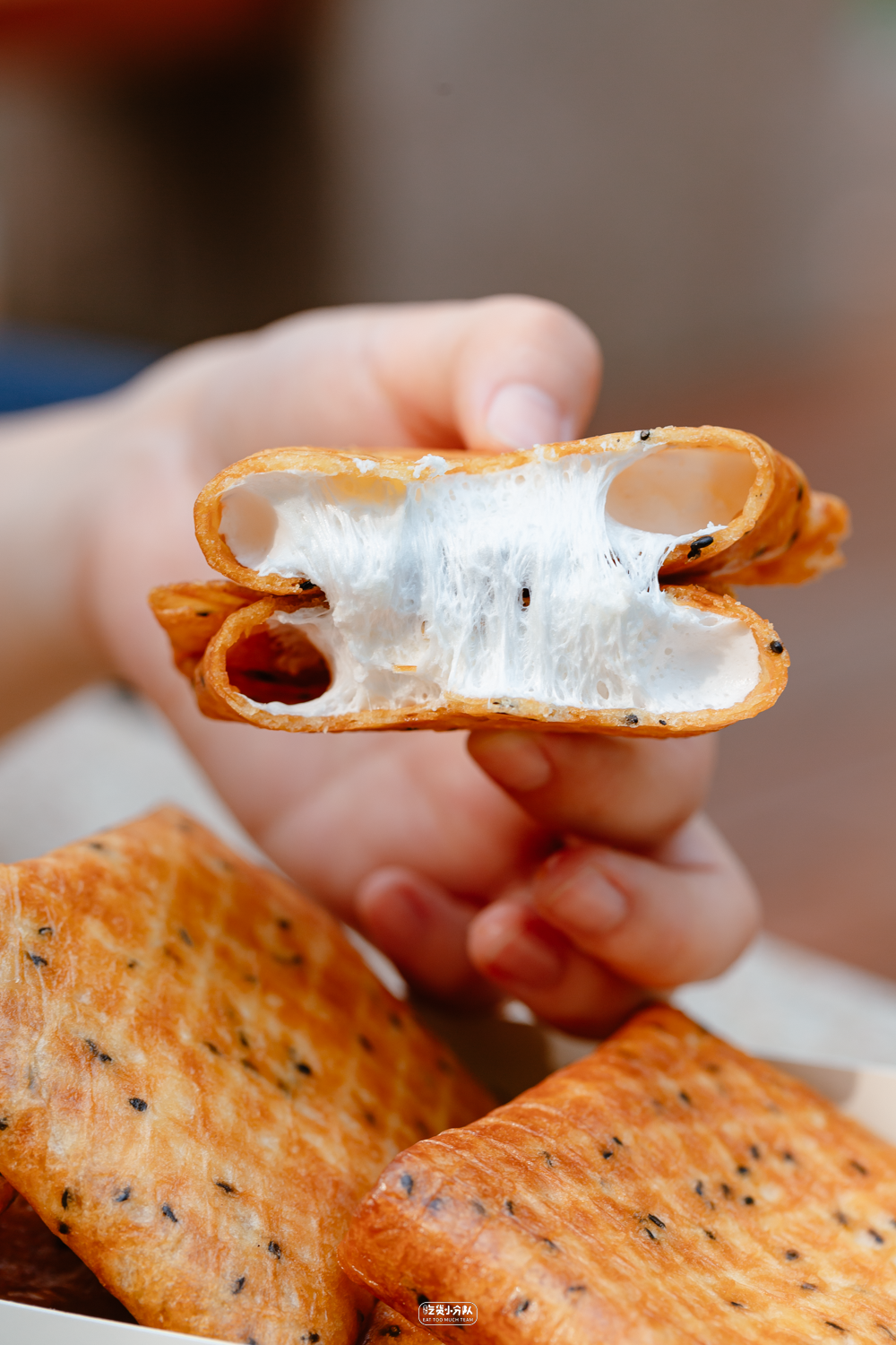 沾满黑芝麻的蛋卷,一盒里面有8个,听过这样一种说法,对甜品的最高评价,就是它不太甜,这个棉花糖蛋卷就是这样,喜欢咸口的还可以选择海苔肉松口味的。
