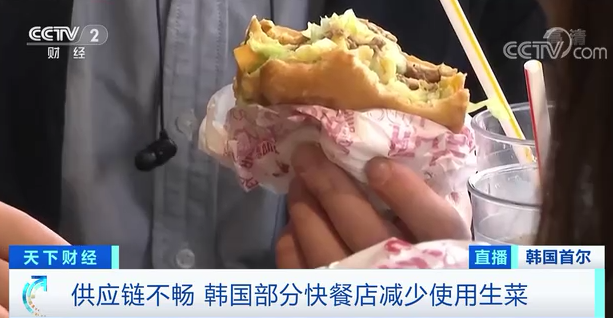 △央视财经《天下财经》栏目视频在韩国,最近不少人发现一些连锁店的汉堡、三明治里没有生菜了。日前韩国麦当劳在官网贴出公告,由于生菜供应不稳定,部分门店的汉堡中可能少放或不放生菜。除了麦当劳,乐天利、赛百味等多家快餐连锁店也表示生菜可能会中断供应。