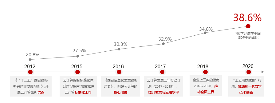 云产业的快速发展离不开国家政策的保驾护航,“十三五规划”期间,国家先后发布《企业上云实施指南2018~2020》、《关于推进“上云用数赋智”行动 培育新经济发展实施方案》等一系列政策持续推动着政企云化进程的深化。与此同时我国数字经济在GDP中的占比几乎翻了一倍,到2023年中国政企的上云率也将达到60%。