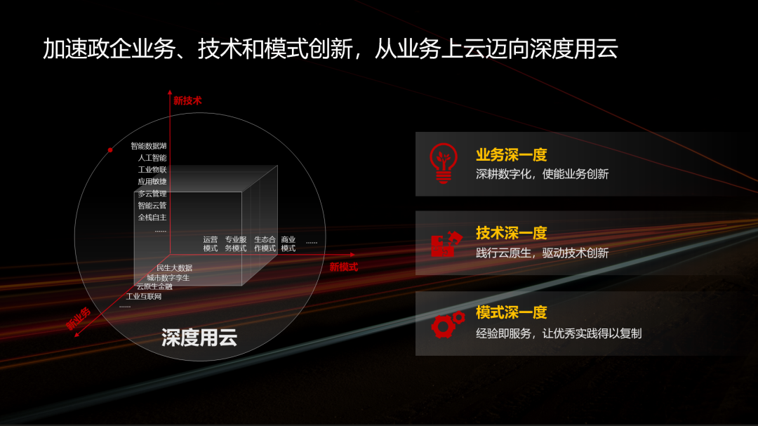 面对日益复杂的业务挑战,政企要在激烈的竞争中脱颖而出,需要技术和业务双轮驱动。将云技术融入到业务场景的方方面面,让技术创新与业务创新深度互锁,持续探索新场景、优化用户体验、提升企业竞争力。