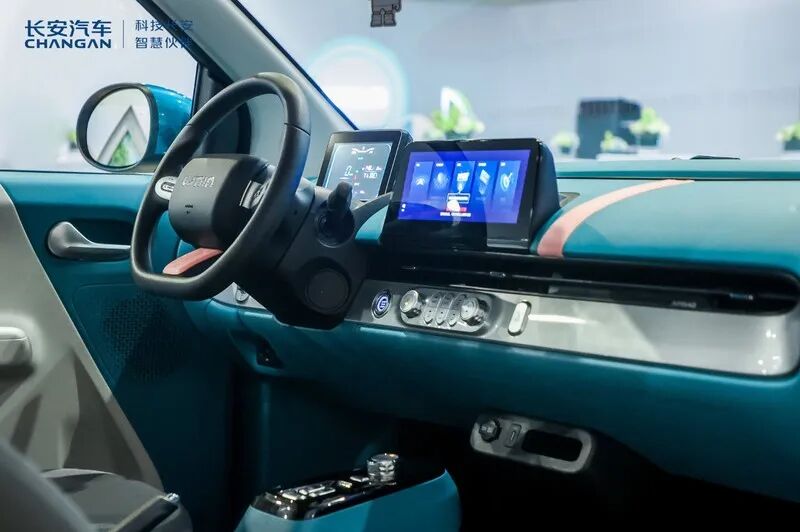 内饰部分,长安LUMIN的内饰风格很简约,作为一款小型车,新车的内饰显得也有些小巧,它的中控台上有两块悬浮式的大屏幕。