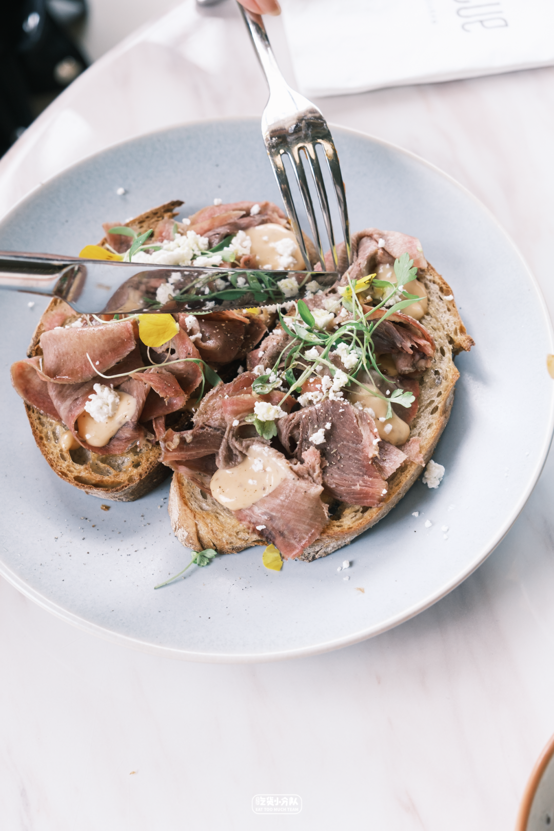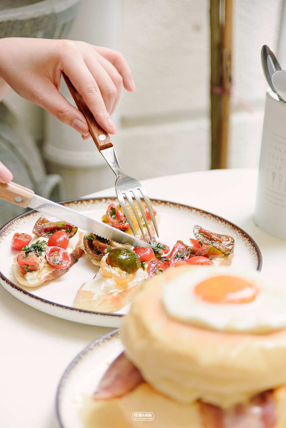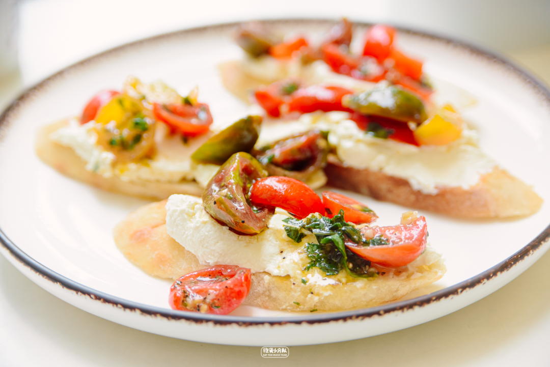 吐司是意式吃法,奶油质地的乳酪清爽顺滑,法式面包麦香十足又外脆里韧有嚼劲,配上腌制过的水果小番茄,吃起来很健康。