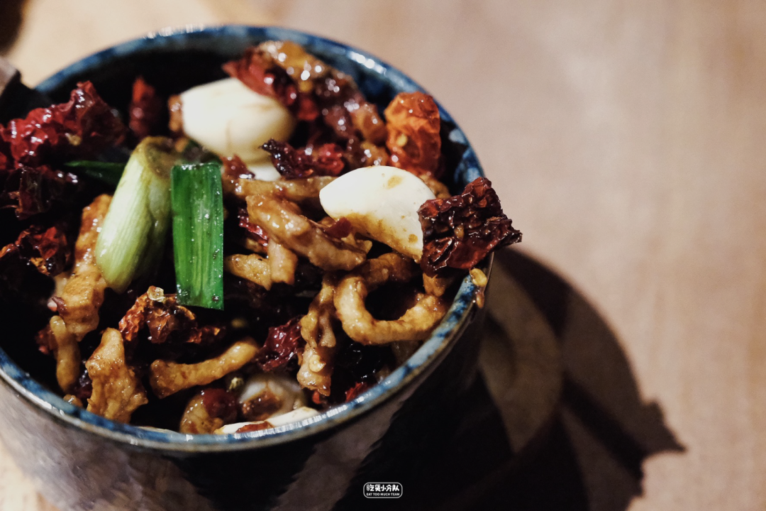 酱爆板筋是用贵州土菜的方法去炒,只用板筋和脊椎之间薄薄的一条肉,很有嚼劲。辣椒放了多种,提香、提辣、提色的,还放了3种花椒和格外多的蒜,香味也比较足。要就着馍馍一起吃。