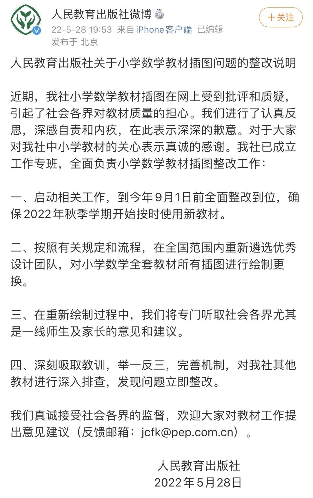 ”我们真诚接受社会各界的监督,欢迎大家对教材工作提出意见建议(反馈邮箱:[email protected])。“人教社表示。