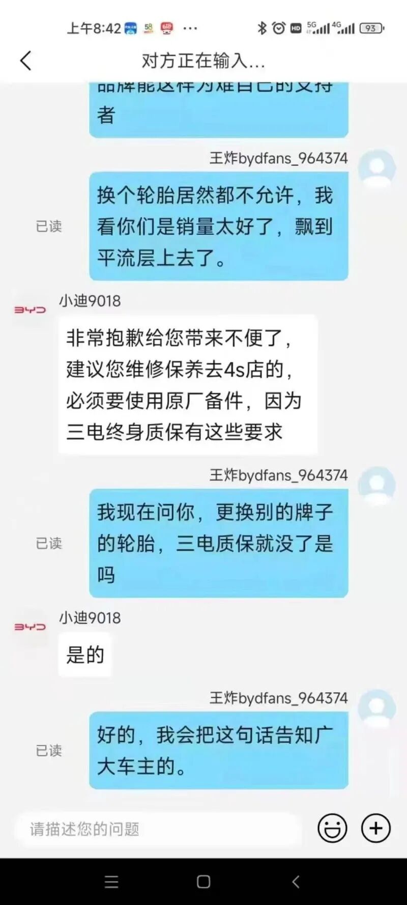有车主投诉:比亚迪的新能源车只要任何配件不是原厂配件,车辆就不能继续享有三电质保,包括轮胎、雨刮器甚至螺丝等零件。消费者认为,车辆使用过程中会有很多意外状况发生,都去 4S 店不方便也不划算,比亚迪的保修条款过于苛刻。