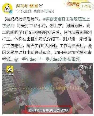 “诚实是人生永远最美好的品格。 只要你撒了一次谎,就需要用一百个谎言,来弥补它。这是个怎么都填不满的大窟窿,最好的解决方法,就是一开始别说谎!”孩子的诚信,将伴随他一生的成长。因此,将诚信教育,作为人格教育的一部分,培养孩子健全的人格,将会是孩子一生受用的品质和财富,对孩子来说也非常重要。 02 孩子怕吃苦,没有恒心和毅力苦和甜,永远都是相对的; 没吃过世间的苦,自然也不会感受到生活的甜。今年1月,河南沁阳,正读高二的闫同学,被妈妈批评后,赌气买票去郑州打工。