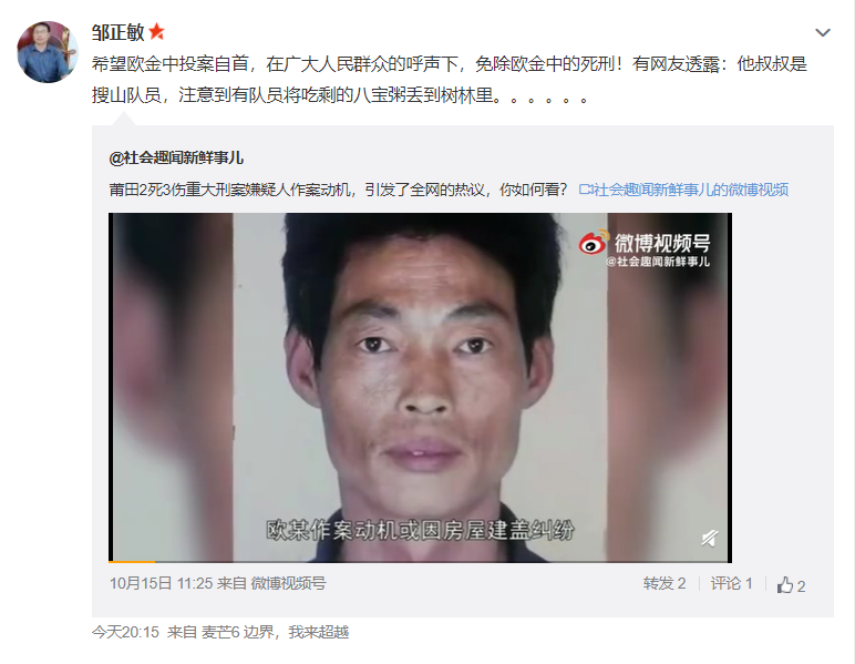 曾经救过落水儿童的欧金中,涉嫌杀害多人潜逃,舆论对其多有同情,甚至希望他逃过搜捕。