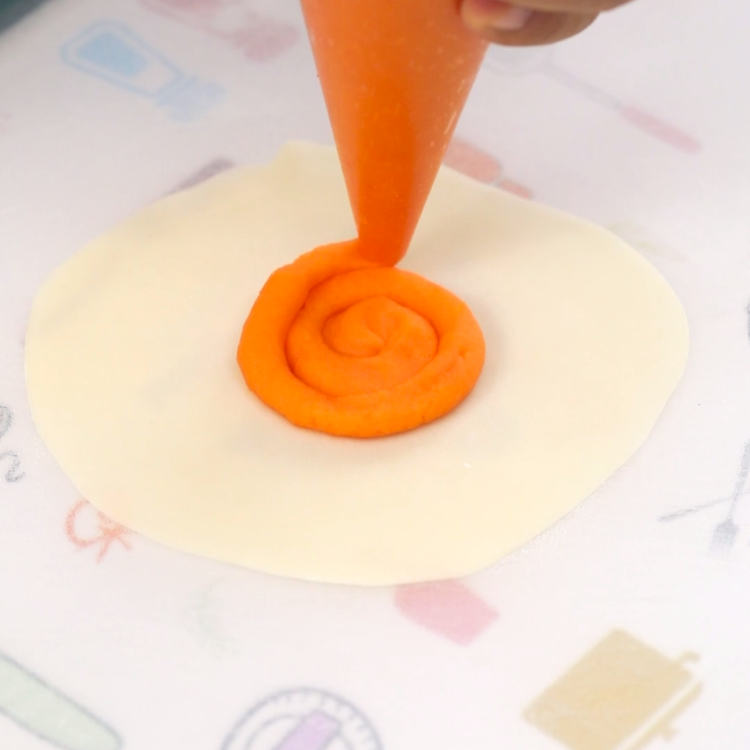 在底部挤红薯泥,我这个红薯泥没加额外液体就比较软了,为了好操作,我就用裱花袋来挤,你可以看情况,没有裱花袋,用勺子填装也可以。