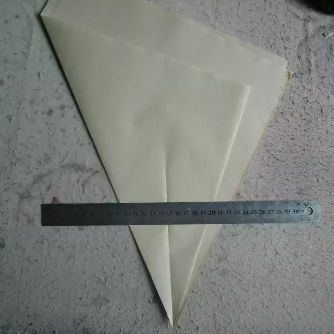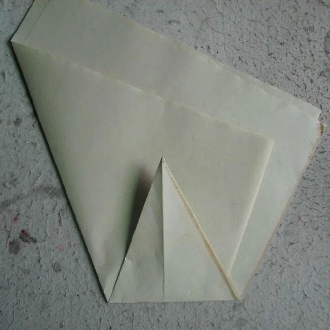 第四步: 将纸呈倒立的等腰三角形状对折决定落款的高度(如图所示)
