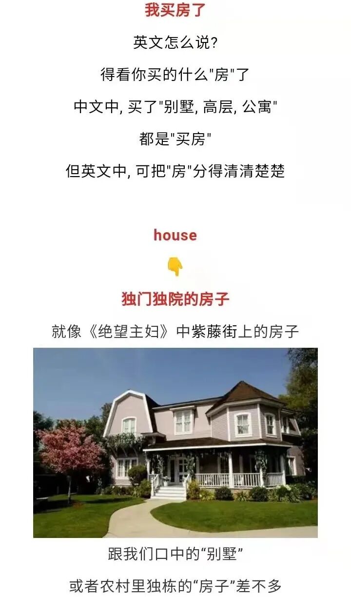 文章进一步解释说house是指独门独院的房子,类似我们所说的别墅,因此buy a house相当于买了独立别墅,大豪宅,买小区商品房要说buy a flat/apartment