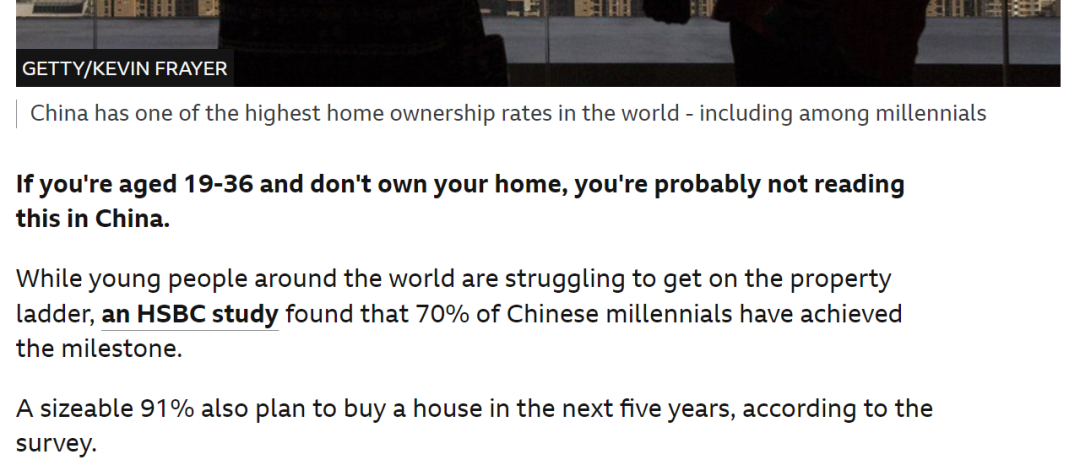 文章写的是关于中国年轻人的买房状况,但也用了"buy a house"这一说法。《福布斯》在一篇报道中国楼市的文章How People In China Afford Their Outrageously Expensive Homes也有这样的句子:
