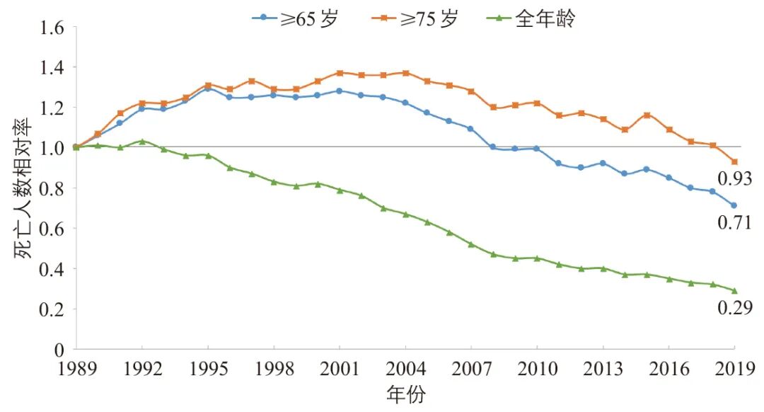 1989—2019年日本交通事故死亡人数变化如图6所示。以1989年各年龄段死亡人数为基准(定为1),2019年全年龄段交通事故死亡人数大幅下降至0.29;而65岁以上尤其是75岁以上人群死亡人数的下降趋势明显弱于全年龄组,2019年分别为0.71和0.93,并呈现先增长后下降的趋势。可见,老年人在交通事故中的死亡人数始终处于较高水平。