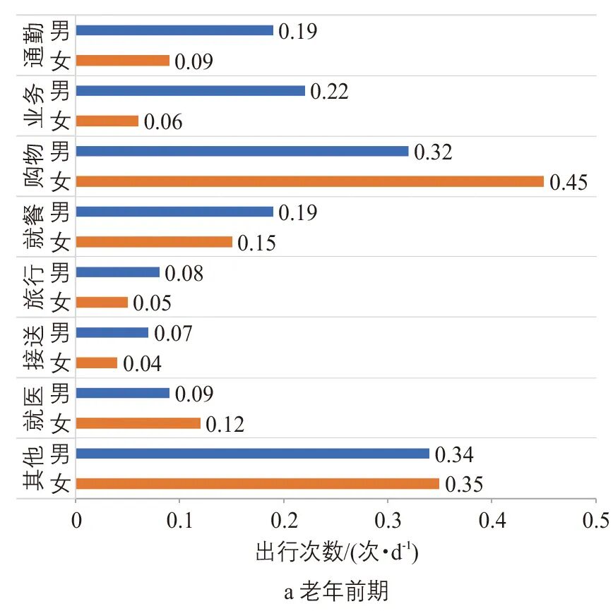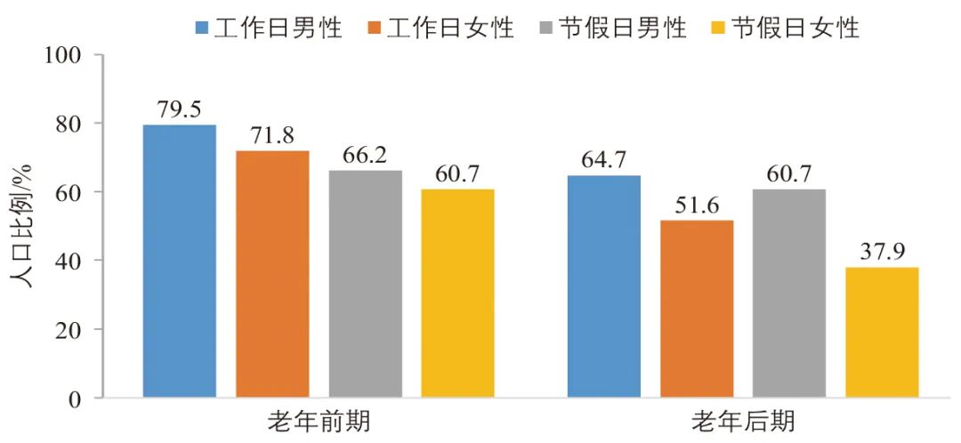 以性别和年龄划分的外出率调查结果(见图2)显示:1)老年人外出率随着年龄增加而降低,男性外出率高于女性。2)老年人工作日外出率均高于节假日。老年前期人口中,男性高出13.3%,女性高出11.1%;老年后期人口中,男性高出4%,女性高出13.7%。3)对于所有组别,老年后期人口中女性节假日外出率最低,仅为37.9%。