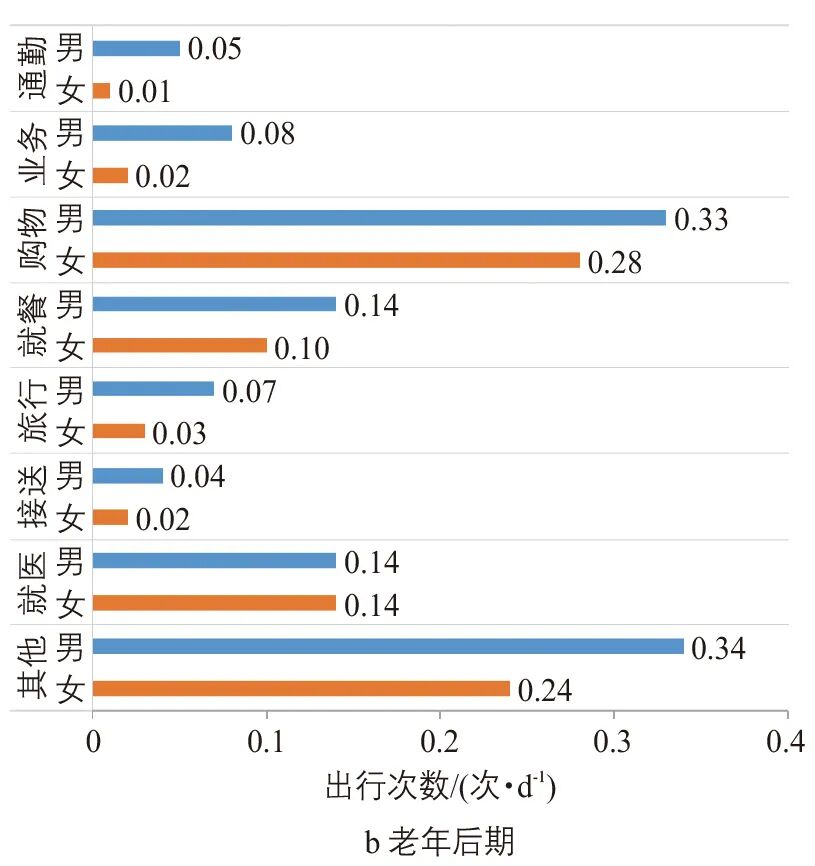 2013年,《高年龄者雇佣安定法》(2021年4月1日施行)修订,预计于2025年4月将日本职工的退休年龄由60岁延长至65岁,目前处于过渡阶段。由于退休后可以自行选择继续工作,因此,日本老年人因工作而产生的业务出行和通勤出行仍占有一定比例。出行目的包括购物、通勤、业务、就餐、旅行、接送、就医等。调查结果如图5所示,老年前期人口最主要的出行目的是购物,其中女性购物出行次数是0.45次·d-1,男性为0.32次·d-1。其次,男性因业务、通勤和就餐而产生的出行也较多。老年后期人口中,主要出行目的同样是购物,但女性购物出行次数明显减少,由0.45次·d-1降低至0.28次·d-1;以就医为目的的出行次数上升至第二位,男性和女性均为0.14次·d-1。将两个年龄段的出行目的进行比较发现,大多数非就医目的出行随着年龄增加而减少,其中业务和就餐出行降幅最大。