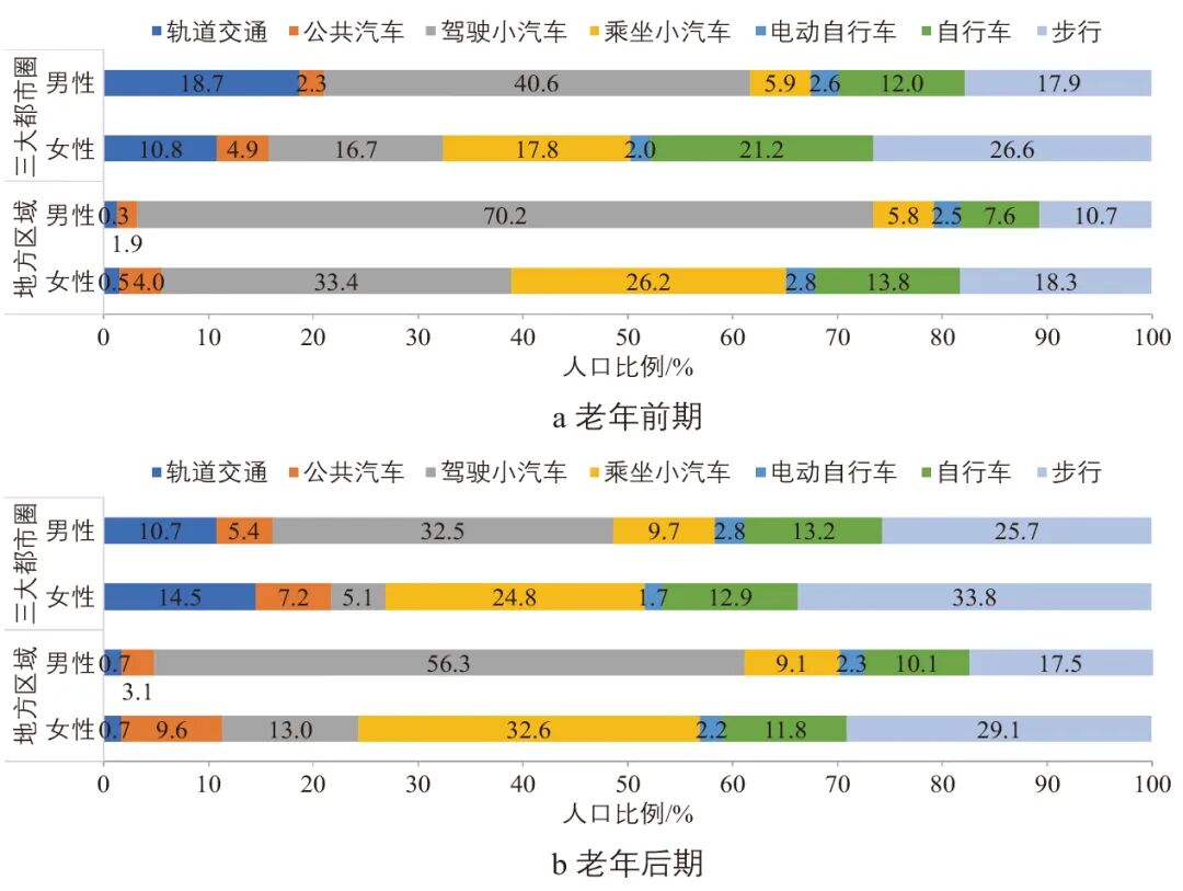 日本居民的主要出行方式包括轨道交通、公共汽车、小汽车、电动自行车、自行车、步行等。其中轨道交通包括有轨电车、城市内地铁、城市间轻轨等。根据性别、年龄及居住区域对老年人出行方式进行调查,居住区域按照三大都市圈和地方区域两类进行划分。从图4可以看出:1)居住区域对老年人出行方式选择的影响显著,与三大都市圈相比,居住在地方区域的老年人对公共交通利用率较低、对驾驶私人小汽车的依赖性更强。2)年龄影响老年人出行方式选择,老年前期人口的主要出行方式为驾驶私人小汽车、骑自行车和乘坐私人小汽车,老年后期人口采用步行和公共汽车方式的出行比例增加。