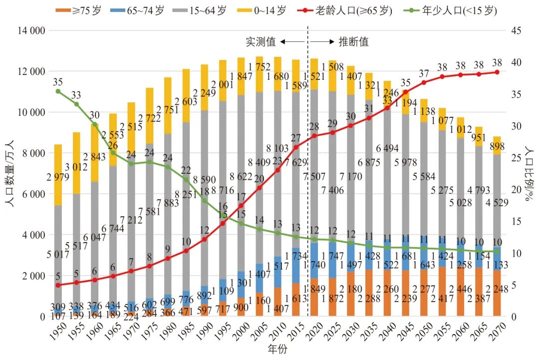 日本将65岁及以上的人定义为老年人。其中,65~74岁定义为老年前期,75岁及以上定义为老年后期。1950—2070年日本人口构成变化见图1,2020年10月,日本总人口约为1.26亿人,老龄人口(≥65岁)为3 619万人,老龄化率(占总人口比例)为28.4%;其中,老年前期人口占总人口13.9%,老年后期人口占总人口14.9%。年少人口(<15岁)所占比例不断降低,于2020年后降幅趋于平缓;老龄人口所占比例不断增高,尤其是2000—2020年涨幅明显。因此,日本人口年龄结构严重失衡且短时间内难以逆转。