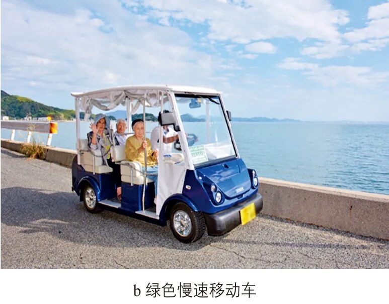 日本国土交通省积极探索帮助老年人安全、健康出行的新方式。出行即服务(Mobility as a Service, MaaS)、迷你车[9]与绿色慢速移动车[10](见图8)等新型交通方式在日本逐步得到推广应用。MaaS是一种可将多种公共交通和其他交通服务优化组合、提供一站式出行的服务方式。迷你车是比小汽车更小巧灵活、更环保且可供1~2人乘坐,在地区间轻松移动的电动车辆,填补了现有小汽车需求的空白,可以发挥应对老龄化社会出行需求的作用。绿色慢速移动车是时速低于20 km·h-1、可乘坐4人以上的电动公共交通方式,由于其具有环保、速度慢、适合短距离移动的特点,作为现有公共交通方式的补充被越来越多的当地居民、游客中的老年人使用。