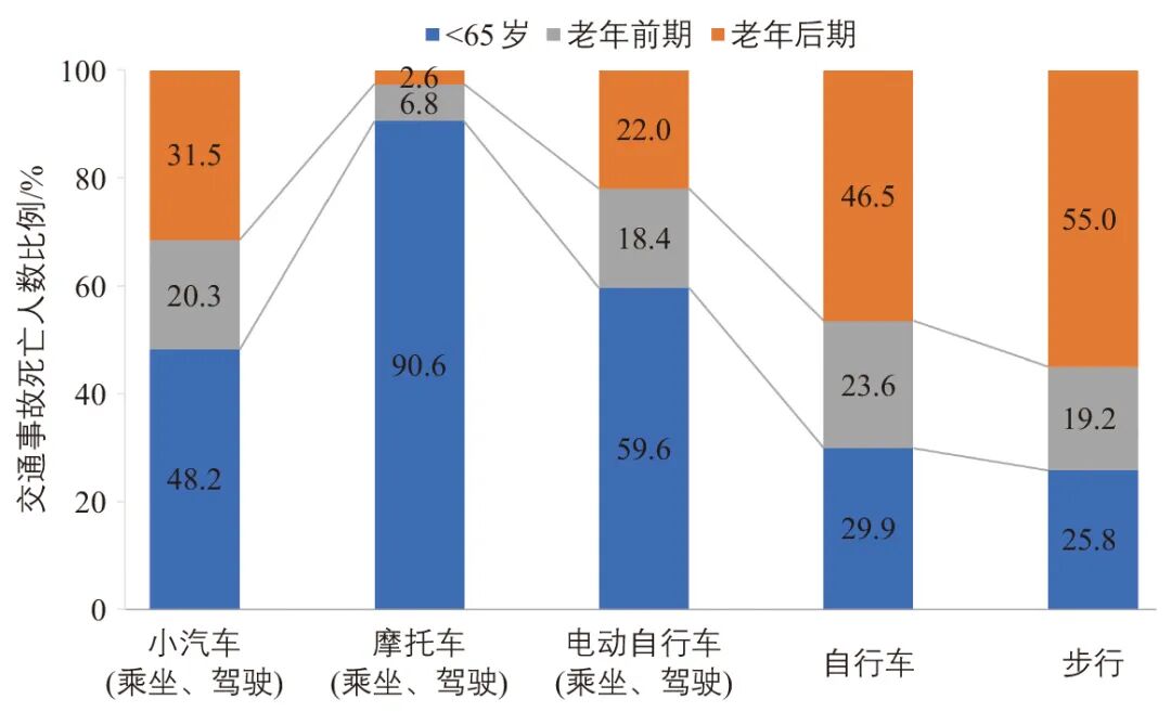 2)老年人交通事故死亡比例与出行方式密切相关。