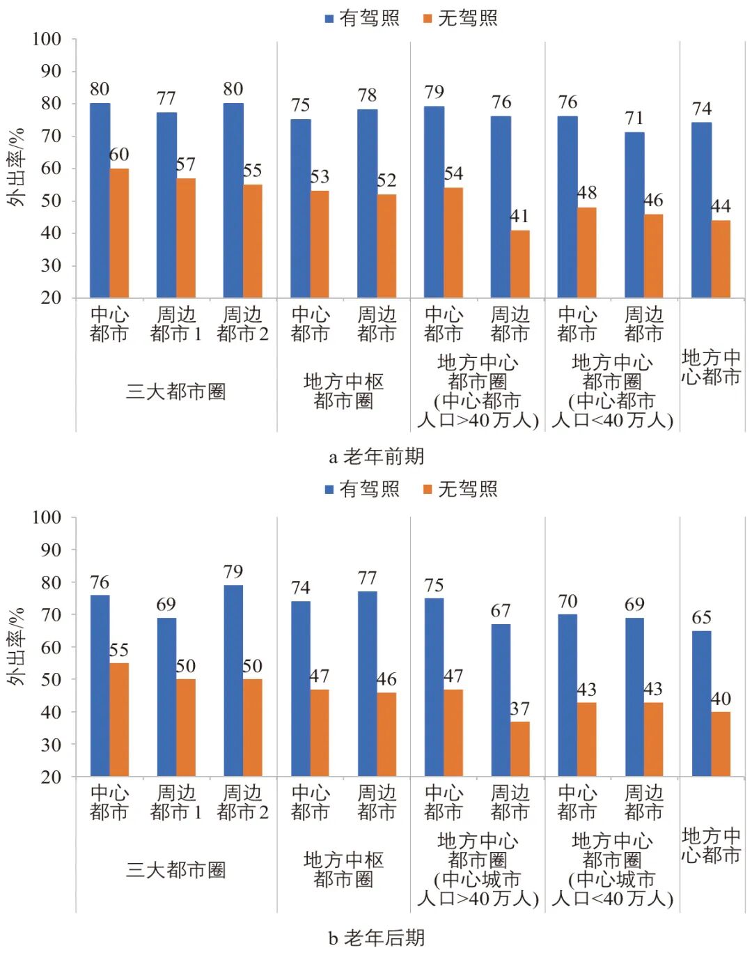 从居住区域和驾驶证持有情况进行更详细的比较(见图3)。日本对驾驶人年龄未规定上限要求,且私人小汽车普及率较高,因此老年人驾驶汽车的现象非常普遍。居住区域按照三大都市圈、地方中枢都市圈、地方中心都市圈(中心都市人口>40万人)、地方中心都市圈(中心都市人口<40万人)、地方中心都市五种类型①进行划分。调查结果显示:1)无驾驶证老年人外出率更低,居住在地方中心都市圈(中心都市人口>40万人)中周边都市的老年后期人口外出率最低,仅为37%。2)居住在三大都市圈中中心都市和周边都市1的老年人有无驾驶证对其出行率影响较小,除此之外,是否拥有驾驶证对任何一个区域非中心都市居住的老年人外出率均有显著影响,最大差异高达35%。因此,居住在非中心都市的无驾驶证老年人群是日本保障老年人安全出行的重点考虑对象。
