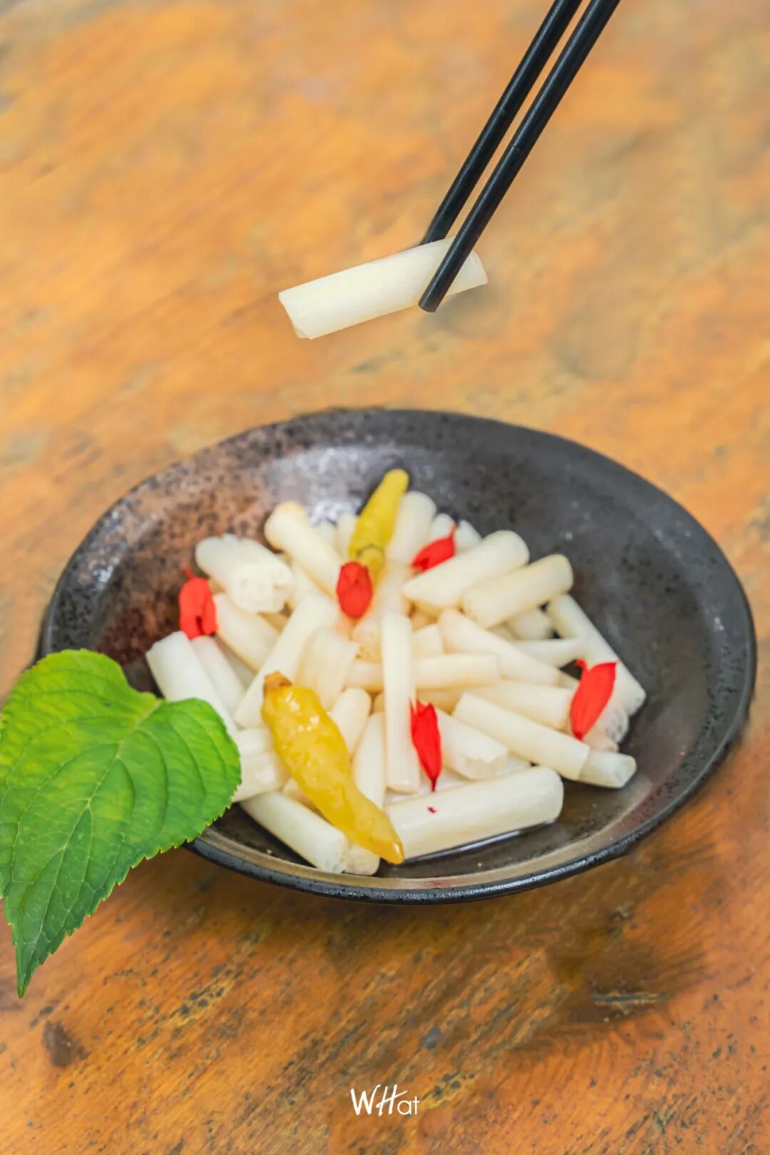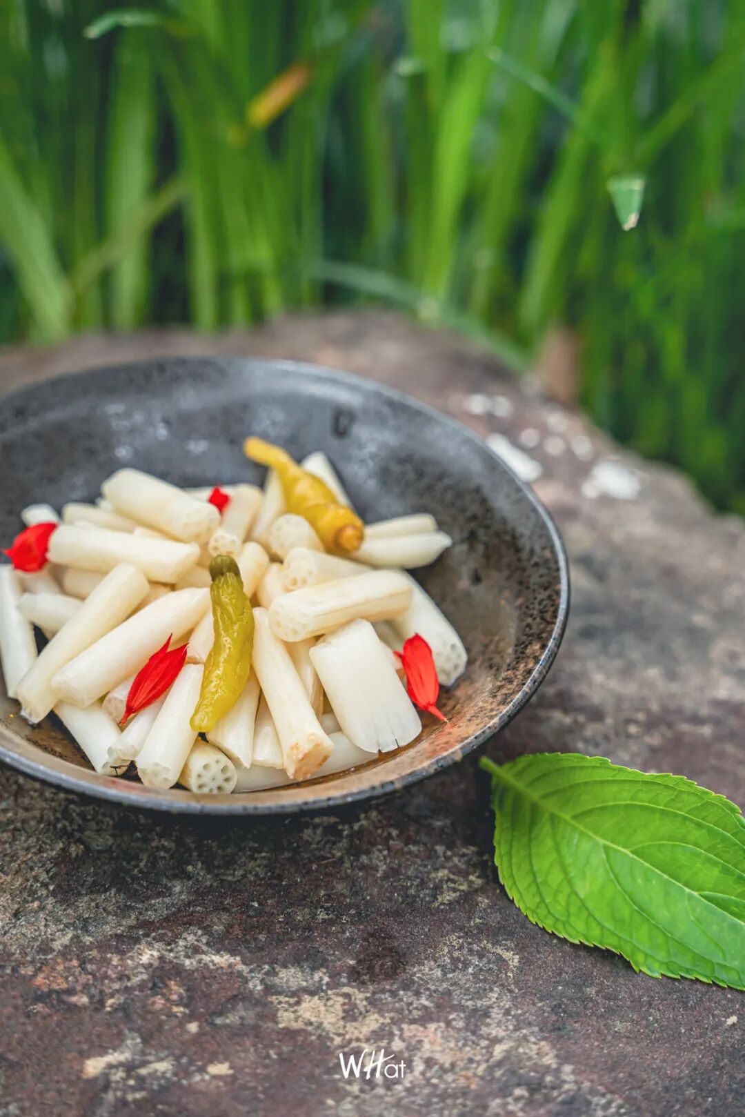 有的人,则把花椒、生姜、大蒜、冰糖、白醋,再配上泡椒和焯过水的藕带,一起放进坛子里密封储存,过些时日再拿出来食用,却是完全不同的一番风味。 泡椒水充分融合了小米椒的辣与白醋的酸,充斥了藕带的每一寸孔洞,咬一口,汁水四溢,酸辣开胃之余,还能感受到藕带本身的那一丝香甜。