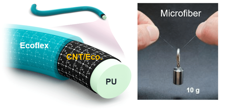 研发团队创造性地以一种高强度、高弹性的新型材料作为导电纤维传感器的内芯,极大增强了其力学性能,让传感器同时具备高力学强度和优异拉伸性能。此外,还利用静电纺丝技术与微纤维网络结构以及封装层的共同作用,极大地提高了纤维传感器对外部活动的敏感度。