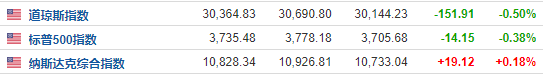 截至收盘,纳斯达克综合指数涨0.18%,报10,828.34点;标普500指数跌0.38%,报3,735.48点,并已经连跌5天;道琼斯指数跌0.50%,报30,364.83点。热门股表现