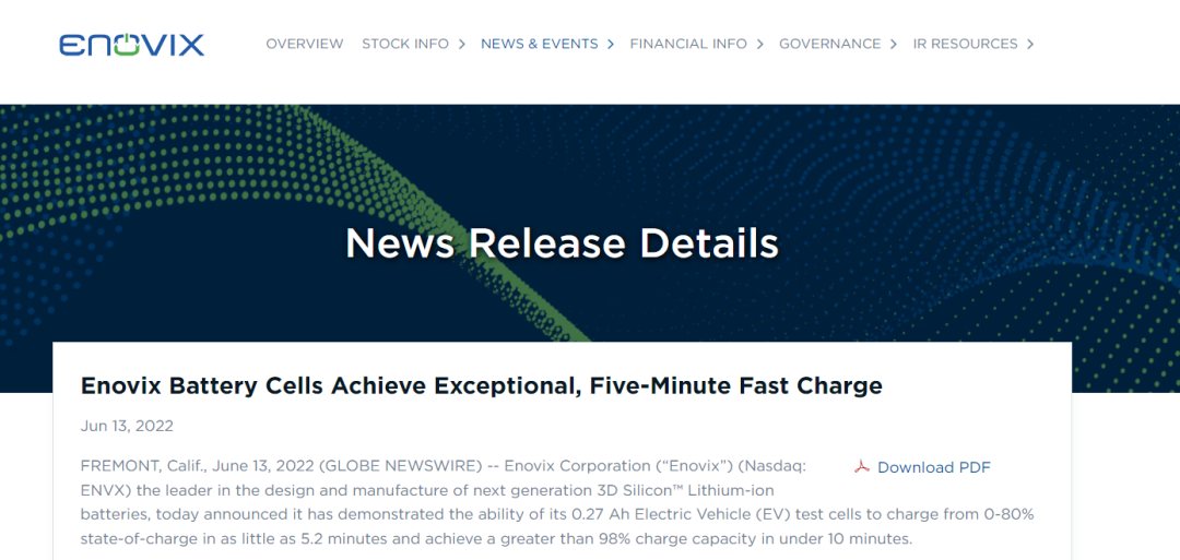 Enovix联合创始人、首席执行官兼总裁Harrold Rust表示,“快速充电能力可以加速电动汽车的大规模普及,我们已经展示出了满足并超过许多同行路线图的性能水平。”