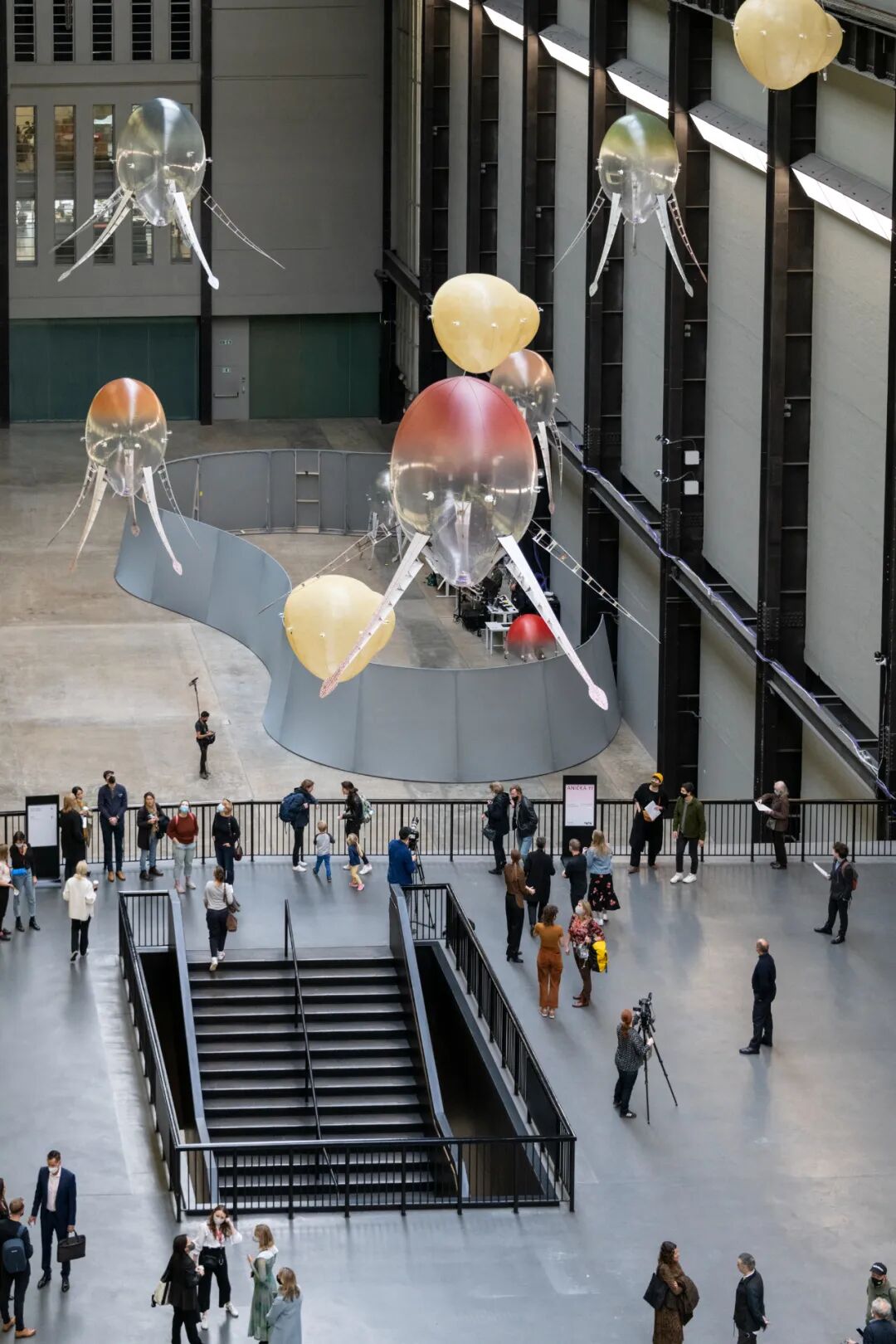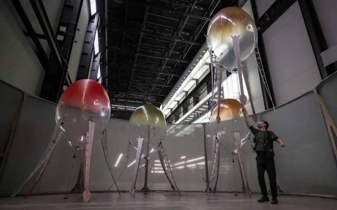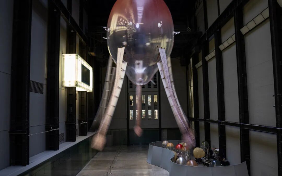 Anicka Yi在《爱这个世界》中,把机器想象成生物,称为Aerobes(好氧生物),它们依托程序,被设定成朝热源漂浮,每次都会做出不同反应。