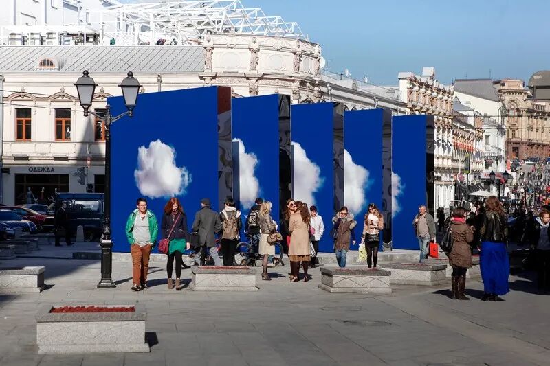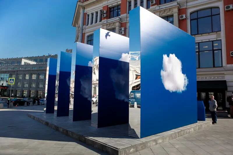 地面上的云跨越了传统博物馆空间的界限,移动城市景观,邀请行人重新诠释了天空。