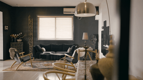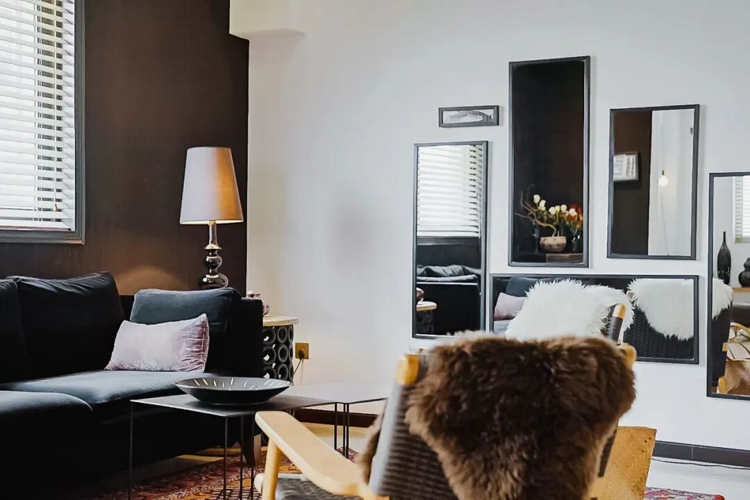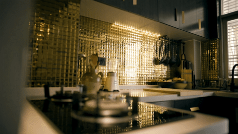 过去在其它城市,Fred住过的房子大多是白色系的。这次,他决定有所不同,部分墙壁被刷成了黑色,厨房的一小块墙壁嵌上了金色马赛克砖,木质物品随处可见。