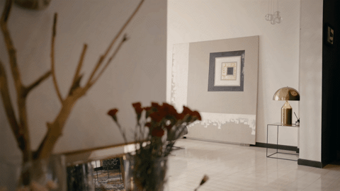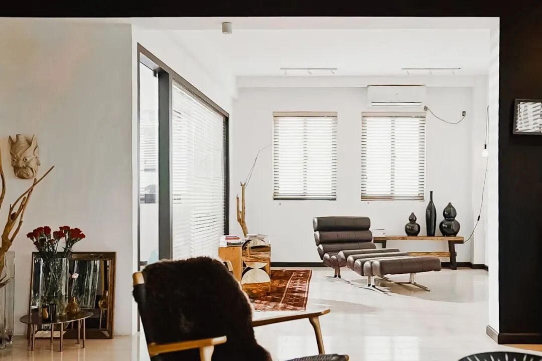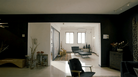 如今一进家门,就能看到远处的厨房一角,和紧挨着的小阳台。走过玄关,一个L型的宽阔客厅就在右手边,同时铺陈开来的,有一组长桌、椅,两组沙发,一件大尺幅的靠墙画作,三三两两淘来的旧门扇、花器。