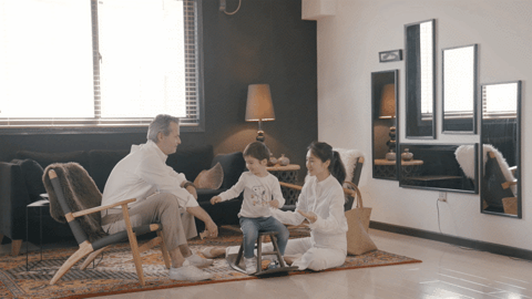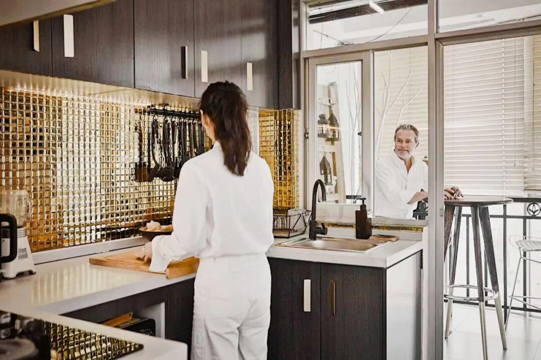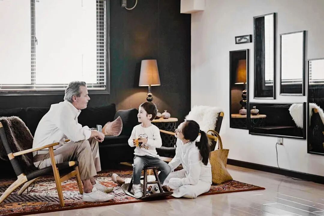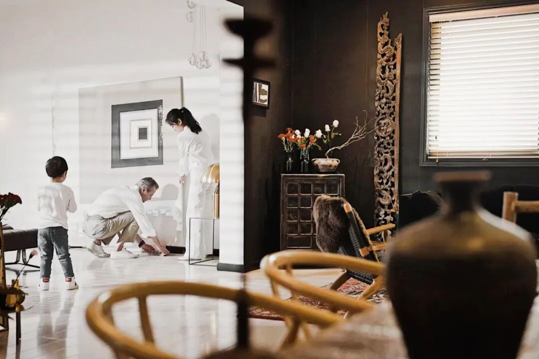 工作余下的时间里,他们则守着彼此,陪伴孩子。家里由Fred亲自设计,有老榆木门板改造的长桌,也有闪亮的金色马赛克砖墙,交织着这个跨国家庭的“旧时光与新念想”。