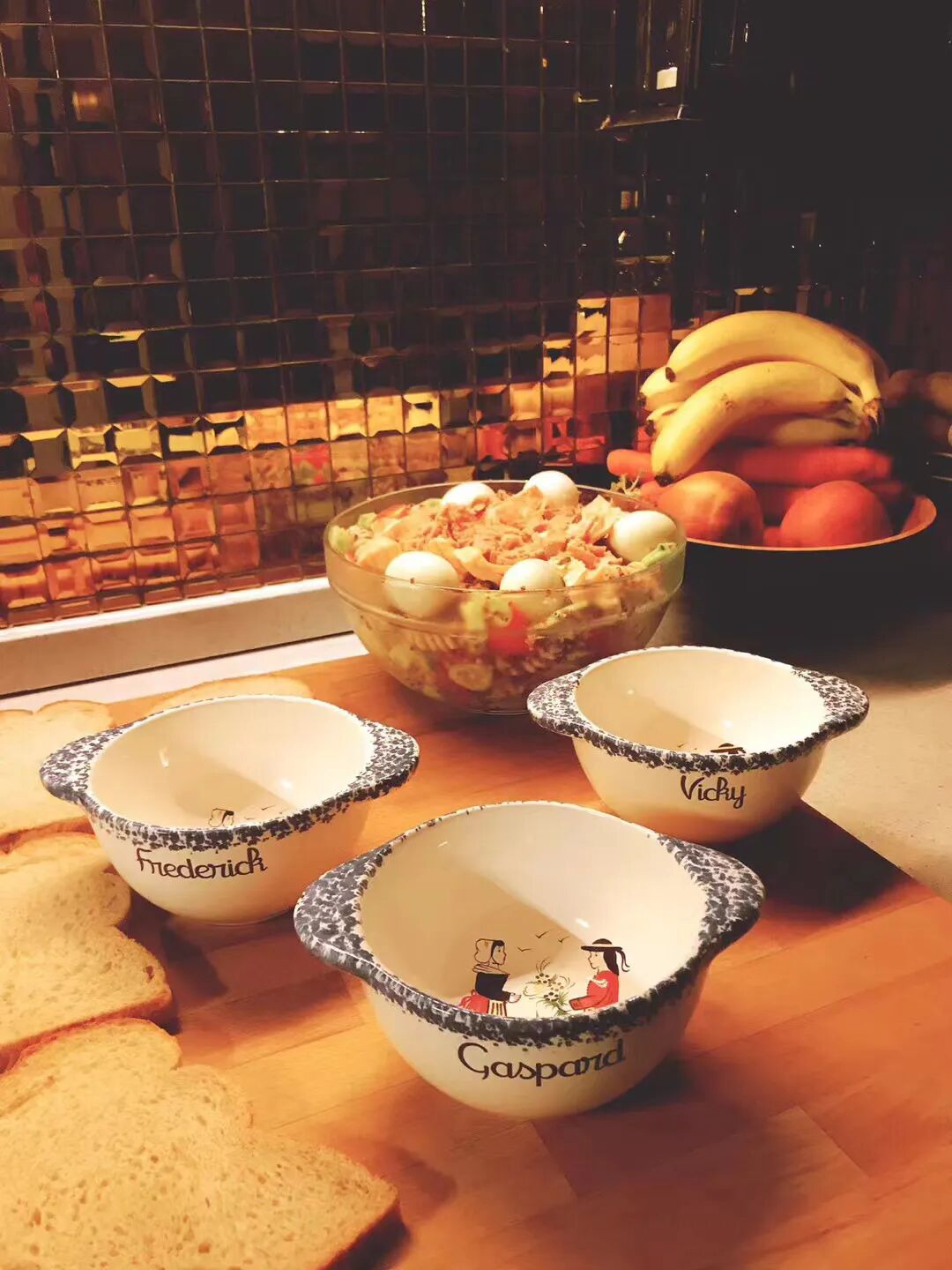 2019年初,两人的儿子出生。Fred的母亲远道探望,送给他们三只手工制作的碗,分别标记着一家三口的名字:Gaspard(儿子),Vicky(王薇)和Frederick。