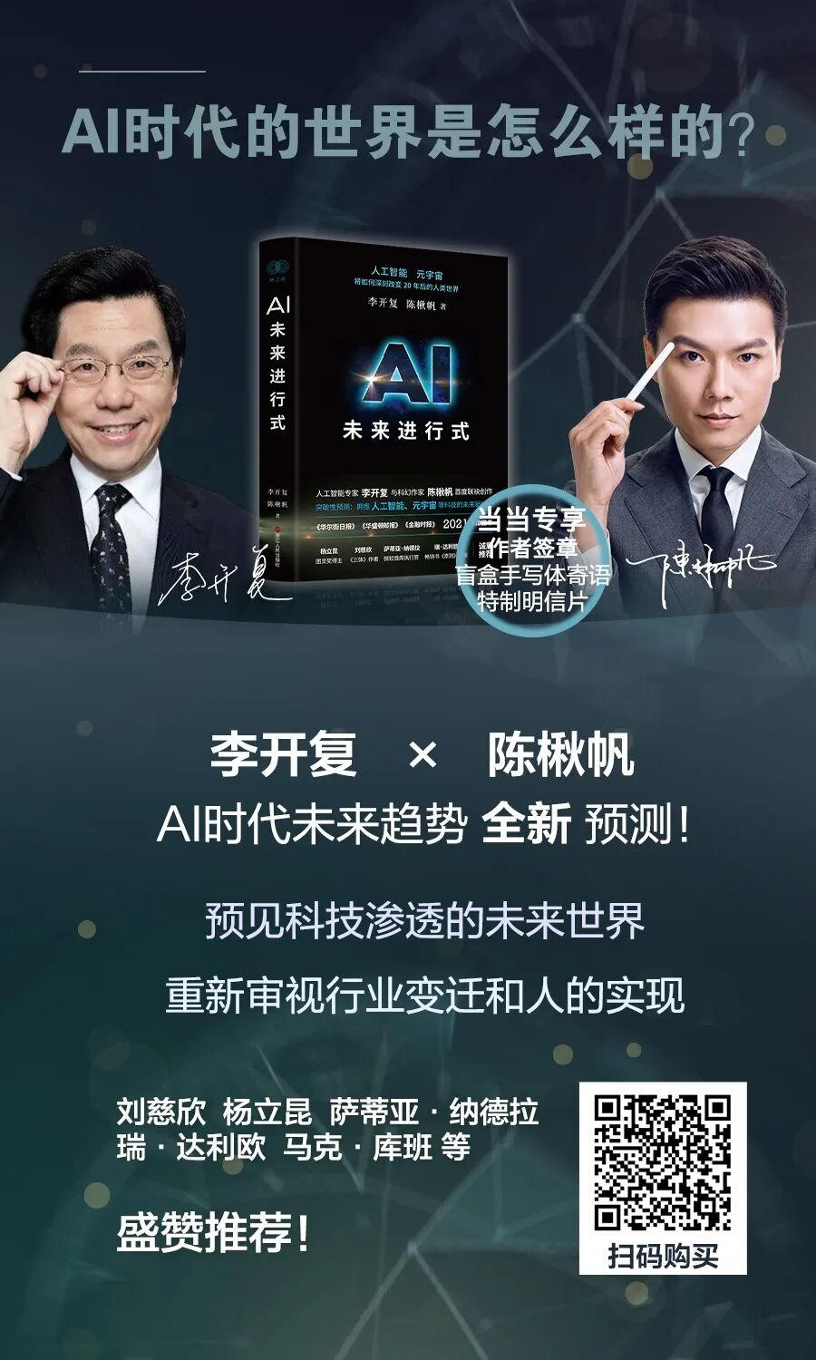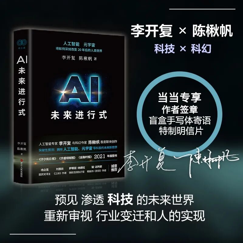 最后,借着“世界读书日”的机会,我也想向大家介绍我的新书《AI未来进行式》,这是我和著名科幻作家陈楸帆合作,将科幻小说与科技评论创造性地融合在一起,畅想了 20 年后在人工智能等科技的影响下的人类世界。