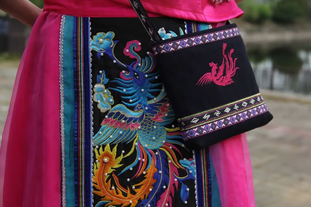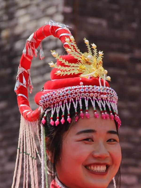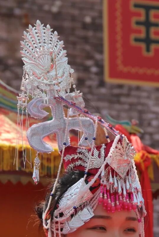 相传美丽的凤凰带来了五彩斑斓的凤凰装,红绳盘头象征着凤冠;全身佩挂叮当作响的银首饰,象征凤凰的鸣啭。