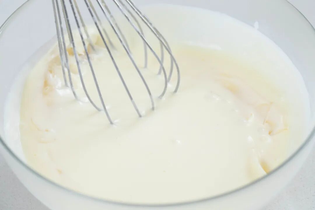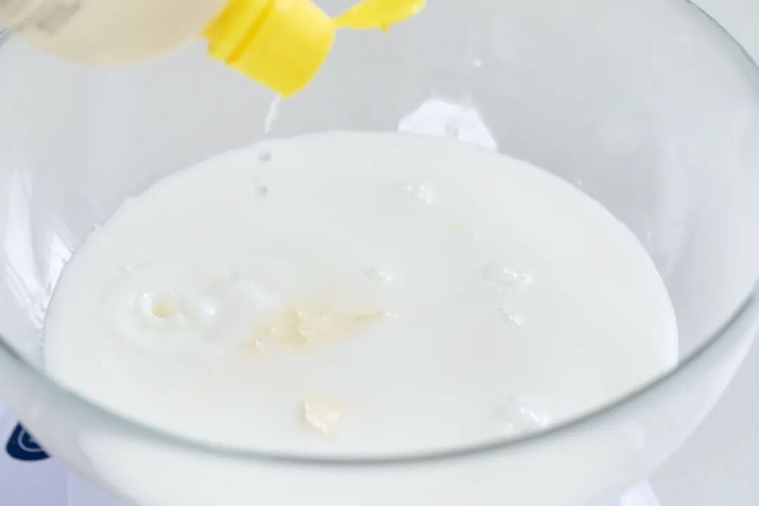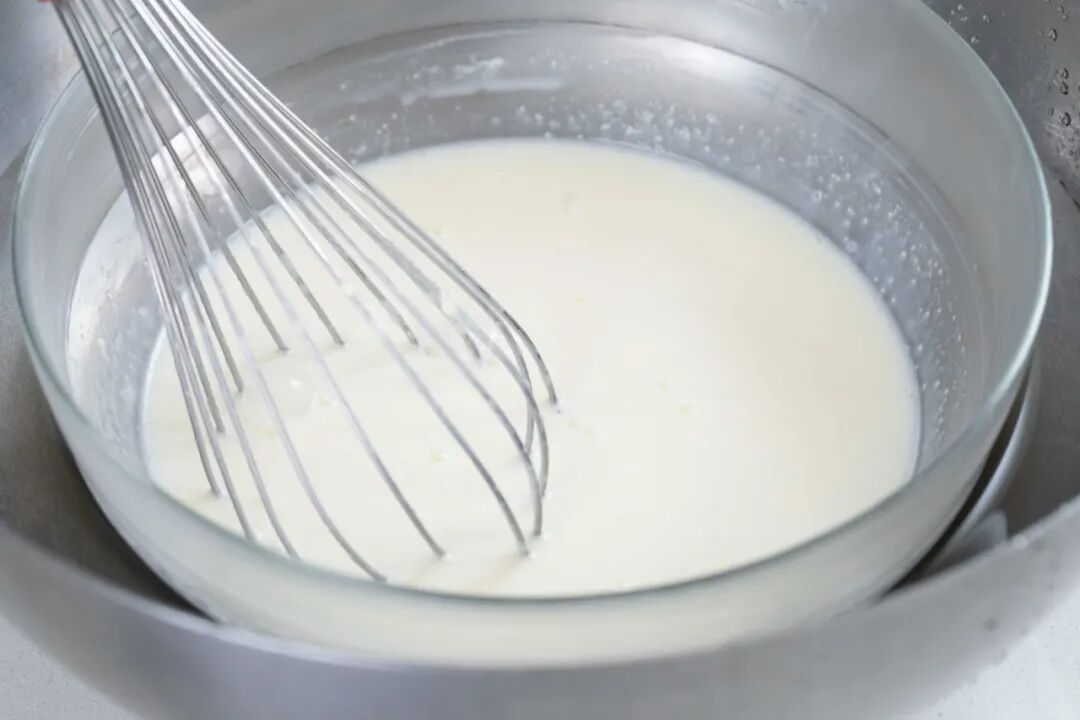 11、迅速搅拌至吉利丁彻底溶解。如果感觉有颗粒,可以过筛一次。