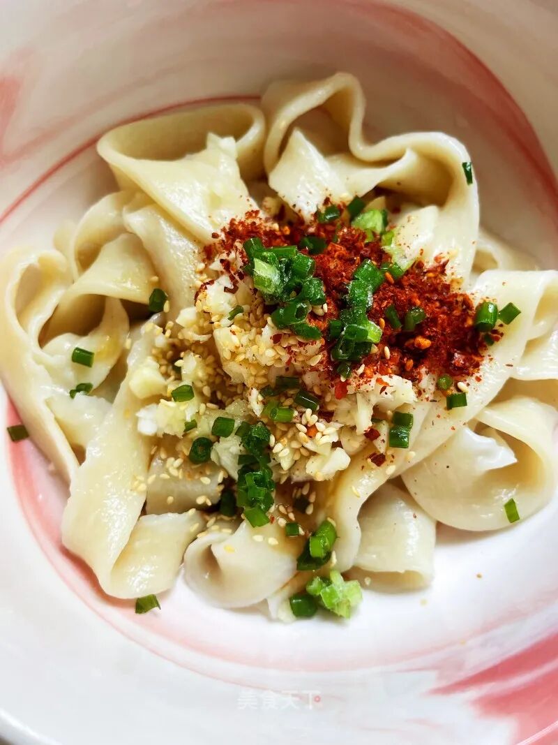 裤带面面坯3个、生抽1匙、香醋1匙、蒜末15g、辣椒面1匙、炒香白芝麻1匙、白糖1撮、葱花随意、香菇精1丢丢、食用油2勺、盐1丢丢。
