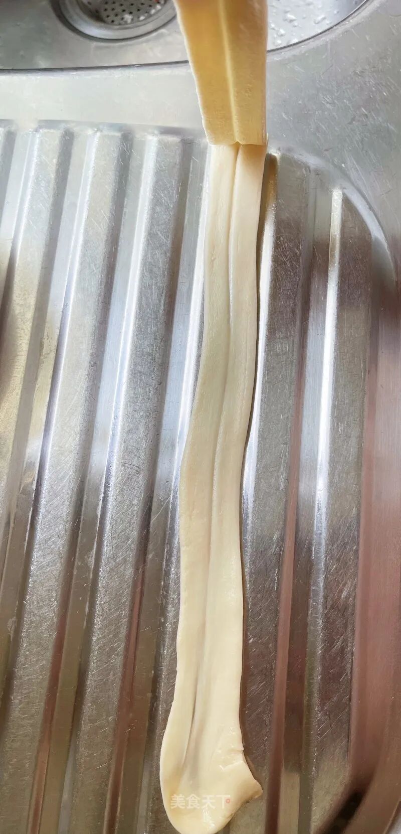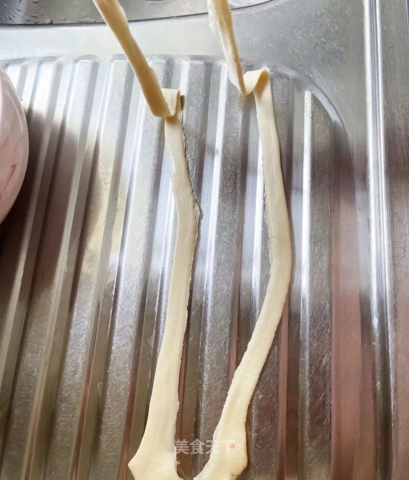 12. 顺着面条中间的压痕,把面条撕开,就会变成一根很长的面条了。
