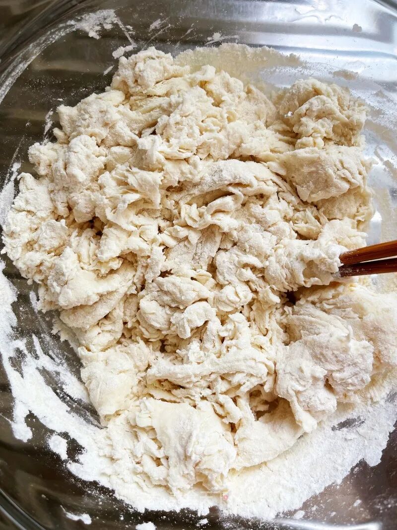 2. 把盐放进面粉,边加水边用筷子搅拌成面絮。