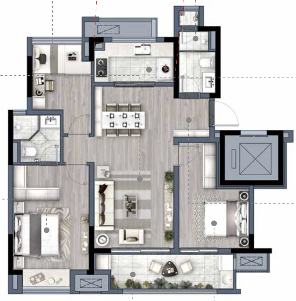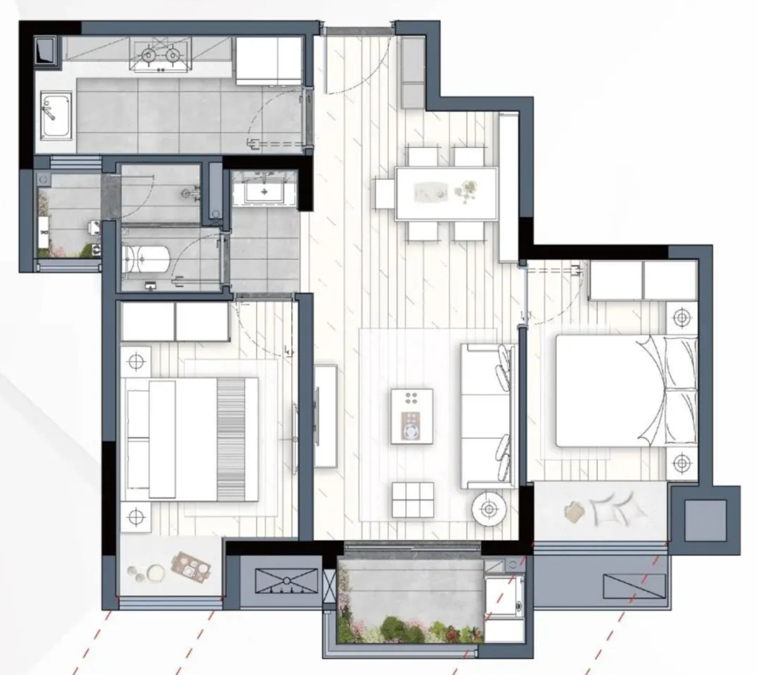 随后,置业顾问还给我介绍起了建面约101平的洋房,约5.2米的阔景阳台,既能作横厅也可以作竖厅,功能性极强;实用的双卫设计,布局也更加合理。