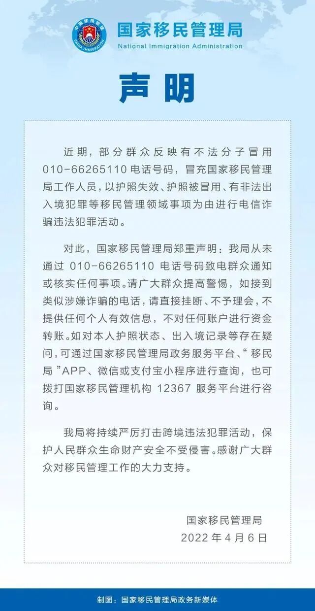 日前,国家移民管理局官方微信发表声明,近期,部分群众反映有不法分子冒用010-66265110电话号码,冒充国家移民管理局工作人员,以护照失效、护照被冒用、有非法出入境犯罪等移民管理领域事项为由进行电信诈骗违法犯罪活动。