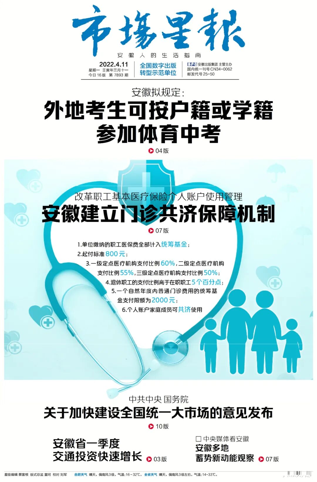 根据安徽省教育厅《关于做好2022年初中学业水平体育与健康学科考试工作的通知》(皖教秘〔2021〕447号)要求,部分地市将于近期举行初中学业水平体育与健康学科考试。4月10日,省教育厅发文称,鉴于我省疫情防控形势依然复杂严峻,为维护广大师生生命安全和身体健康,保障2022年体育中考工作安全有序开展,今年将创新体育中考模式,可引导外地考生在缓考期内回户籍所在地参加体育中考;亦可由学籍所在地代为组织实施体育中考。安徽建立职工基本医保门诊共济保障机制 安徽省财政厅近日会同省医保局出台了《安徽省建立健全职工基本医疗保险门诊共济保障机制实施细则》。《细则》明确,个人账户家庭成员可共济使用。个人账户可用于支付职工本人及其配偶、父母、子女在定点医疗机构就医发生的由个人负担的医疗费用、缴纳参加城乡居民基本医疗保险。据悉,《细则》自今年7月1日起执行。