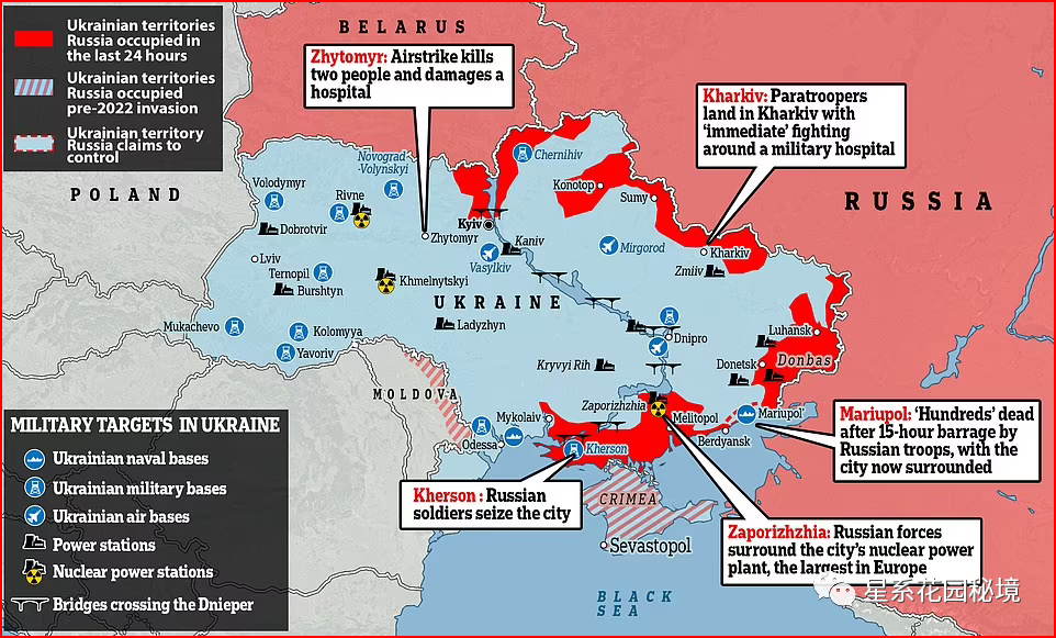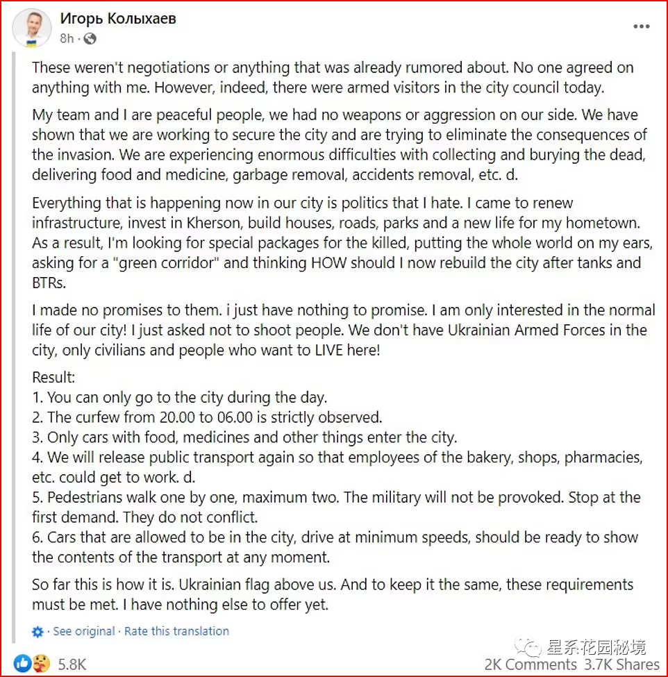 赫尔松市的市长伊戈尔·科利哈耶夫在凌晨1点左右的个人账户上中说,俄罗斯的“武装游客”闯入了一次市议会大厅,实施了包括严格宵禁在内的新规定,市长敦促全市公民遵守这些俄军定下的规定。乌克兰军队似乎已经全部撤离,英国国防部周四却依旧表示,目前情况“很不清晰”。